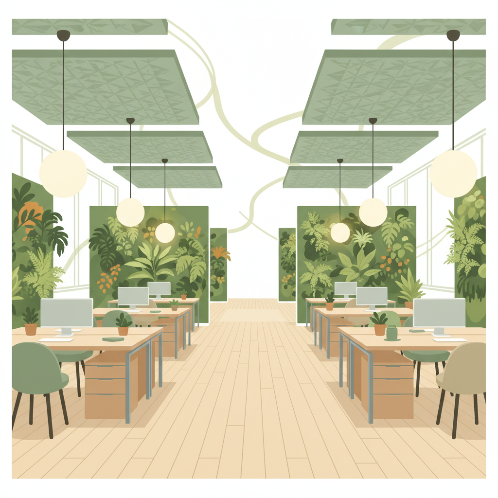 A biophillic office space - Warm wood finishes and brushed metal accents  Sage-green colour palette inspired by nature  Soft, layered lighting that adapts throughout the day  Generous walkways and acoustic dampening materials  Living plant walls and garden integration - AI generated illustration