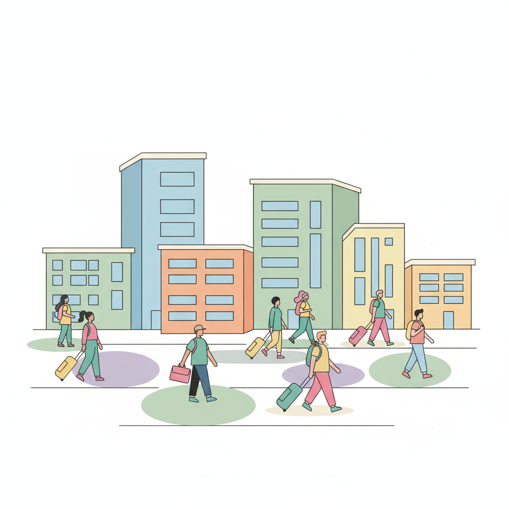 A soft-colored, modern city environment with apartment buildings in different heights and students walking with backpacks or dragging small luggage - AI generated illustration