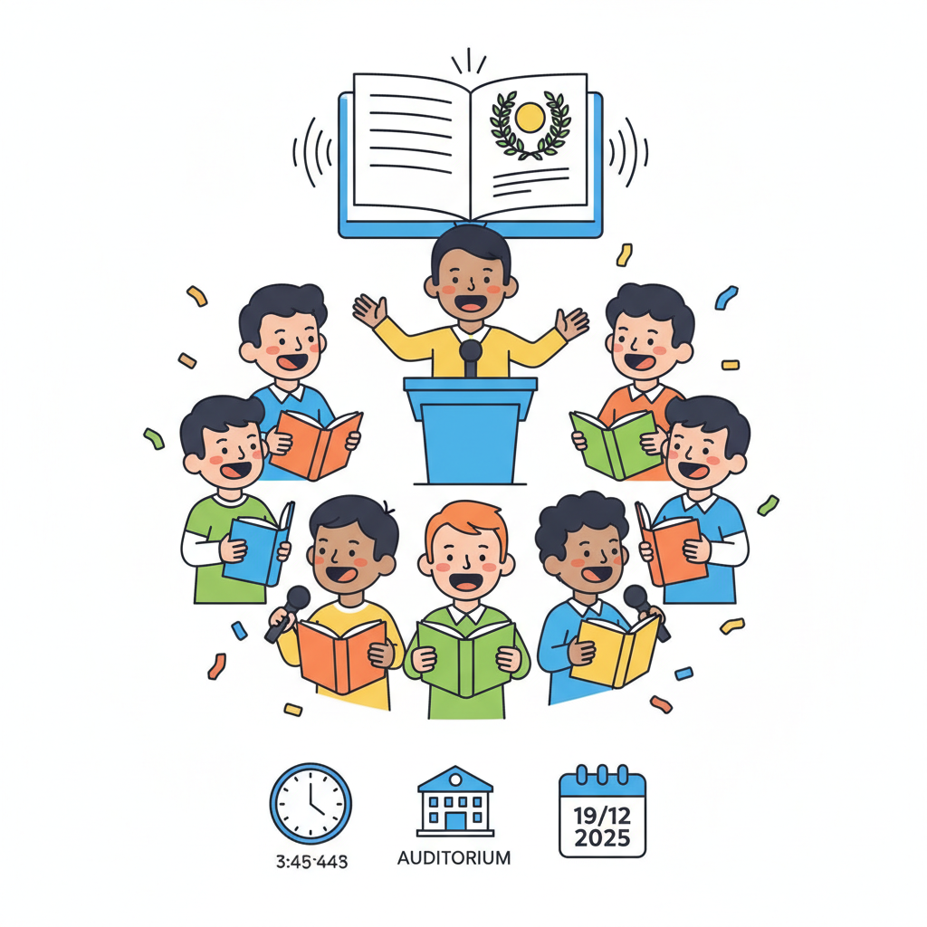 St. Xavier's Boys Academy presents  ENGLISH ELOCUTION STD III  Timings: 3.45 pm to 4.45 pm Venue: Sologran Auditorium Date: 19/12/2025  Come and cheer the young talent! - AI generated illustration
