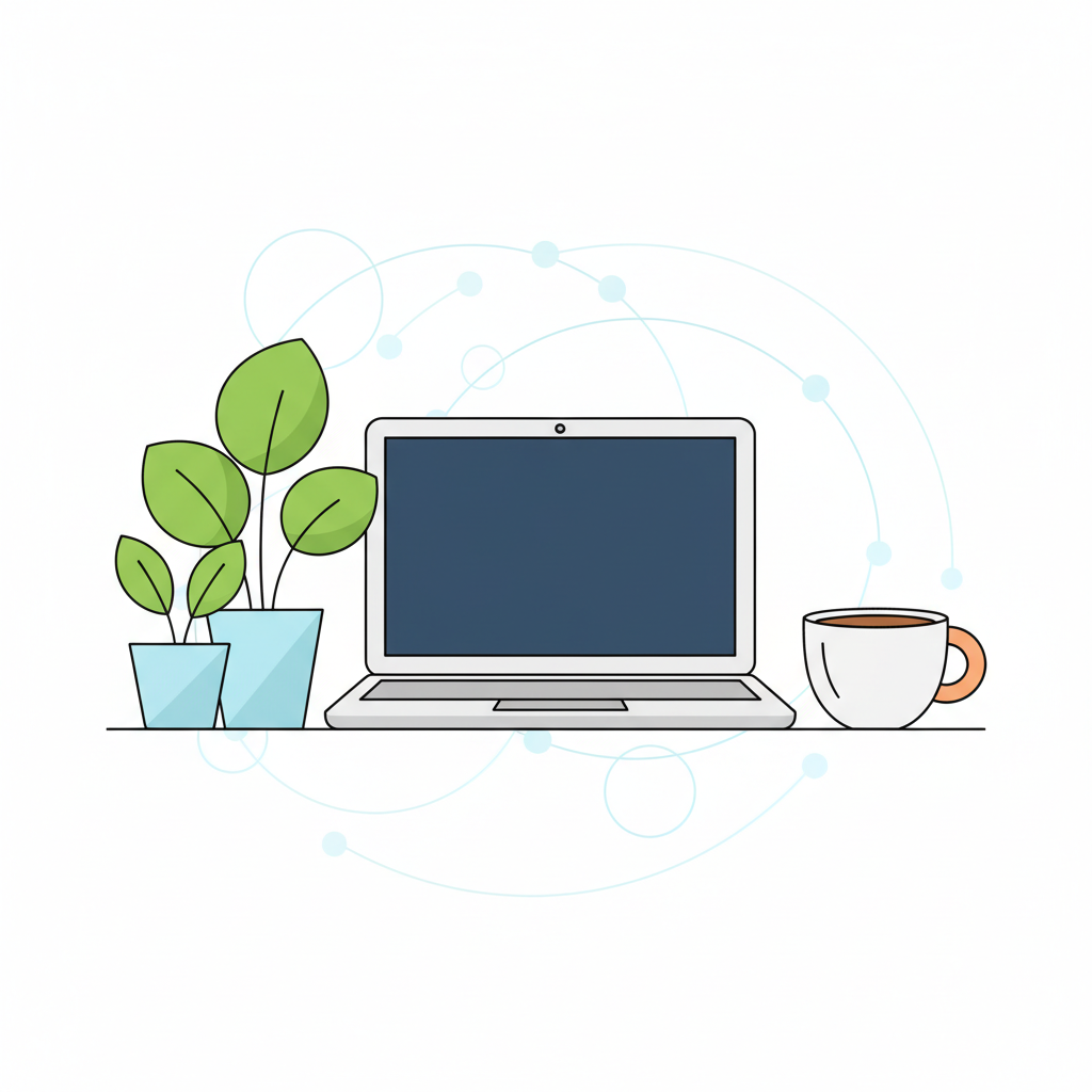 A minimalist workspace with a laptop, coffee cup, and plants, featuring clean lines and modern design elements