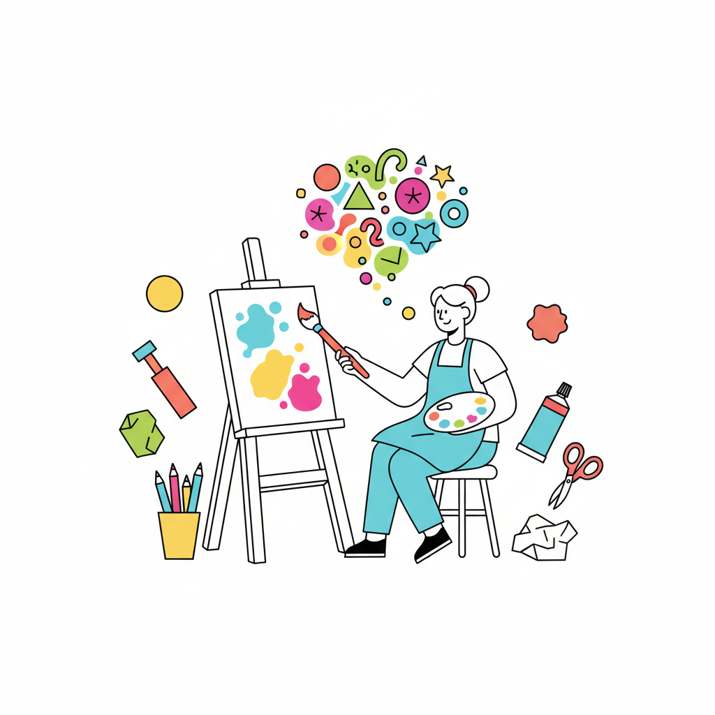 An artist at work with paintbrushes, canvas, and creative tools, surrounded by colorful inspiration elements
